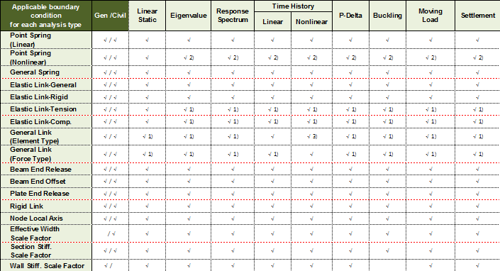 Note 1) Corresponding links are considered as elastic links of general type. 2) Nonlinear type point spring supports are considered as linear type in the analysis. 3) Inelastic hinge properties can be assigned to the Spring Type of General Link. 4) Properties of the corresponding boundary condition cannot be changed during construction stage. 5) General Link Property changes must be defined in the 'Change General Link Properties', and the changes can be applied in the Boundary Change Assignment to Load Cases/Analyses. 6) In case tendon profile data are entered 7) In case 'Load Cases for Pre-Composite Section' data are entered (Load > Composite Section Analysis Data > Load Cases for Pre-Composite Section)