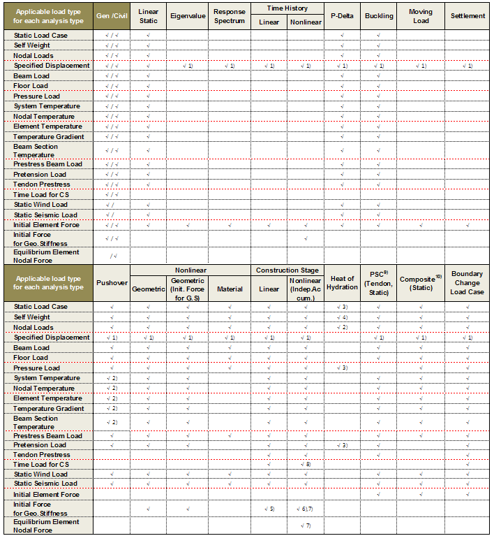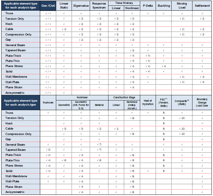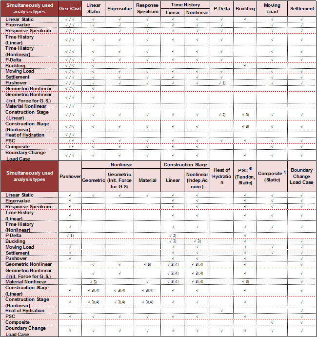 midas Gen and Civil are general purpose finite element analysis software. The significant modeling features based on the various element types, material/section DBs, boundary conditions and load types enable the practicing engineers to undertake virtually all types of structural analyses. However, some restrictions apply to the features in that some of the features cannot be used simultaneously. For example, Support Settlement Analysis and Heat of Hydration Analysis cannot be performed simultaneously. Also Plane Strain element cannot be applied to Bucking Analysis. The following tables show such restrictions: 1. Analysis types, which can be used simultaneously 2. Elements, which can be used, by analysis types 3. Materials and sections, which can be used, by analysis types 4. Boundary conditions, which can be used, by analysis types 5. Load cases, which can be used, by analysis types