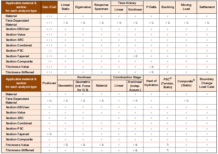 Note 1) Analysis can be performed, but time dependent material properties are not reflected. 2) Tapered beam elements are considered as prismatic beam elements (averaged). 3) Elastic stiffness of the corresponding element is reflected in the analysis. Geometric stiffness is not considered. 4) Geometric nonlinear analysis can be carried out with accumulated effects of the models of each construction stage. 5) Thin plate elements are considered as thick plate elements. 6) Geometric nonlinear analysis can be carried out for each construction stage independently. 'Accumulative Stage' option cannot be applied. 7) Tendon cannot be applied except for beam elements. 8) In case tendon profile data are entered 9) In case 'Load Cases for Pre-Composite Section' data are entered (Load > Composite Section Analysis Data > Load Cases for Pre-Composite Section)