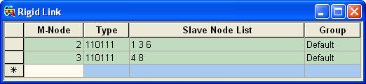 M-Node: Master Node number Type: Flag the slave nodes' degrees-of-freedom to be Linked to the master node DX: Displacement degree-of-freedom in GCS X-direction DY: Displacement degree-of-freedom in GCS Y-direction DZ: Displacement degree-of-freedom in GCS Z-direction RX: Rotational degree-of-freedom about GCS X-axis RY: Rotational degree-of-freedom about GCS Y-axis RZ: Rotational degree-of-freedom about GCS Z-axis Slave Node List: Slave Node numbers Group: Boundary Group in which the entered boundary conditions are included |