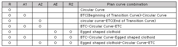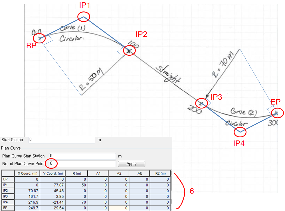 Coordinate Data: Using the Multi-Curve Advanced option, the curvature can also be defined for a combination of straight and curve geometries. Start Station: The start station of bridge modeling Plan Curve Define the horizontal curve(s). Plan Curve Span Start: start station of plan curve No. of Plan Curve Point: Number of Plan Curve points. At least two of the plan curve points are required for the beginning point (BP) and the end point (EP). If the bridge has more than one curve or is a combination of curve and straight geometries, the number of plan curve point is equal to or greater than three. If three or greater number is input for the number of plan curve point, additional intermediate points (IP 1 for three plan curve pints, IP 2 for four plan curve points, …) BP: The beginning point of the plan curve EP: The end point of the plan curve IP 1, 2, …: The intermediate points. (IP 1 for three plan curve pints, IP 2 for four plan curve points, …) X Coord.: the x coordinate of the curve point Y Coord.: the y coordinate of the curve point R: The radius of the curve point A1: The parameter of BTC(Beginning of Transition Curve) A2: The parameter of ETC(End of Transition Curve) AE: The parameter of egged shaped clothoid curve R2: The 2nd radius of egged shaped clothoid curve