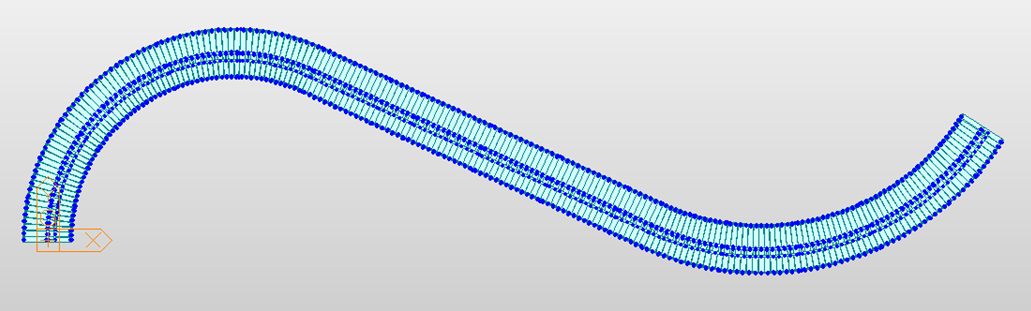 Select Curve Data or Coordinate Data as an input method and click Curve Data: Using the Multi-Curve Advanced option, the curvature can also be defined for a combination of straight and curve geometries. Plan Curve Define the horizontal curve(s). Straight Line: The start and end location of the straight line. Circular Curve: The start and end locations of the plan curve with specified radius of the curve point. Transition Curve: The start and end locations of the transition curve with specified radius of the curve point. Vertical Curve Station: The station of the vertical curve ELEV.: The elevation of the vertical curve Curve Length: The horizontal length of the vertical curve Bank Rotation Station: The station of the bank rotation Super Elevation: The super elevation of the bank rotation. Example