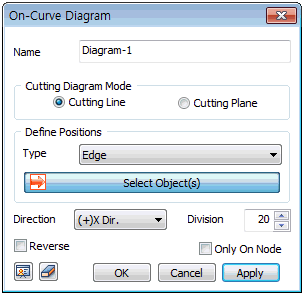 The diagram direction follows the GCS and the default direction is the (+) direction. To draw the diagram in the opposite direction, check the [Reverse] option. For the edge, select [Only On Node] to draw the diagram on that node position. Only one edge can be selected.