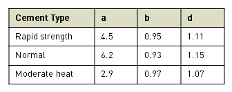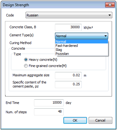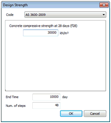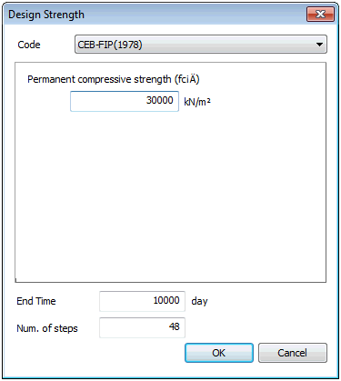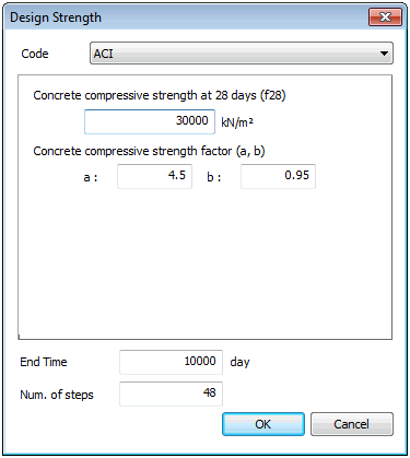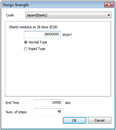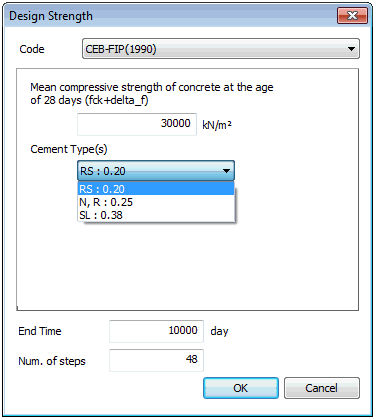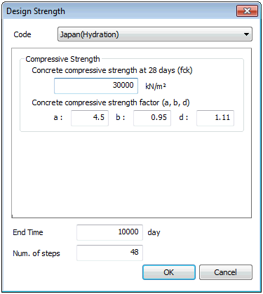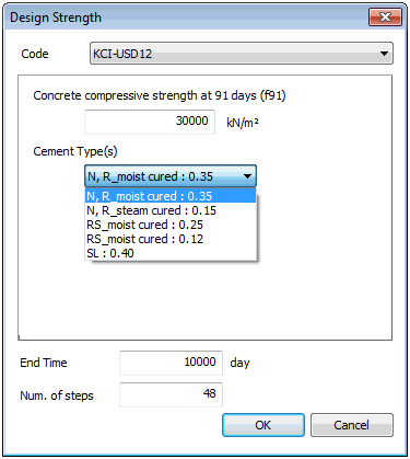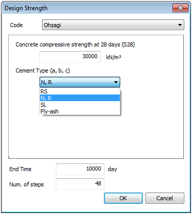 The equation proposed by Ohzagi is used to define the change of compressive strength of concrete. Specify the Concrete Compressive Strength at 28 Days and Cement Type