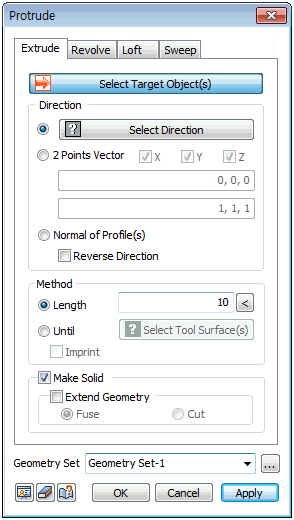Input the geometry shape (face, line, point) for the Extrude operation and enter the extend direction and length. The extend direction can be set using the following 3 methods: