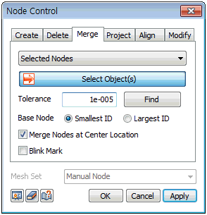Select the nodes to merge and define the merge criterion. The tolerance is the allowable limit of the merger; nodes with spacing smaller than the tolerance are merged. Selecting ‘find’ automatically searches for nodes below the tolerance. The merged node positions are specified by the node number (Smallest ID/Largest ID) or the Center of Nodes (Merge Nodes at the Center Location). The [Blink Mark] function indicates the Free Nodes on the screen, which can be used to distinguish modeling errors such as Free Edges.