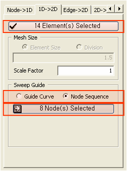 1. Select and confirm 14 1D Elements to perform Sweep. 2. Select Node Sequence in Sweep Guide 3. Select the 8 nodes in sequence. 4. After defining the appropriate Property, click the button to assign. 5. Click [OK].