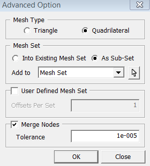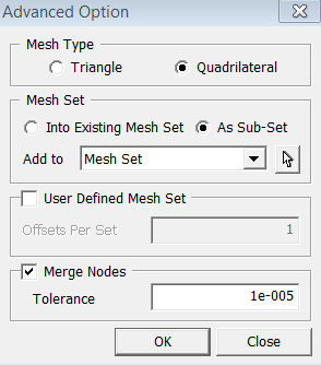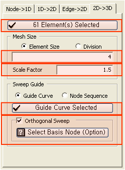 Note 1. When the object edge for Sweep Guide is already seeded, it is not necessary to set the Mesh Size because the program will generate the mesh using the defined seeding. 2. When the object edge for Guide Curve is already seeded, the program will generate the mesh along Sweep Guide with the pre-assigned seeding regardless of the mesh size defined in the dialog. |