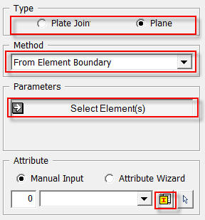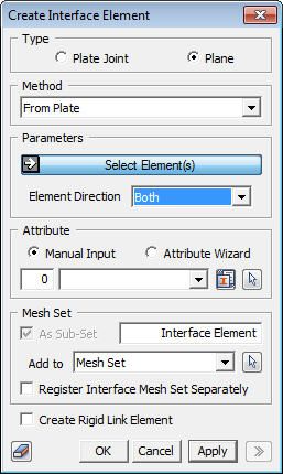 1. Select Type: Plane 2. Select Method: From Plate 3. Select plate element : 1 Element 4. Element Direction: Both 5. Check on Register Interface Mesh Set Separately. 6. Click [OK].