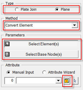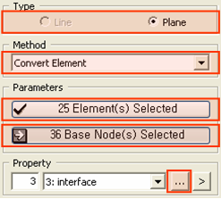 1. Select Type as Plane. 2. Select Method as Convert Element. 3. Select 25 Elements to be converted into an Interface Element. 4. Select 36 nodes as Base Nodes. 5. Click 6. Click [OK].