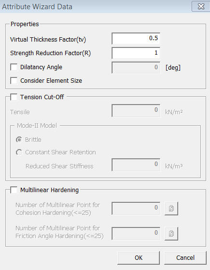 Virtual Thickness Factor (tv) : This parameter is used to derive the interface elastic stiffness from the soil stiffness. Interface stiffness must be large enough to produce negligible relative displacements before plastic slip or tensile debonding occurs. However, increase in interface stiffness value compared to the surrounding soils stiffness can result in numerical instability in the analysis. The wizard estimates the associated interface stiffness (N/m3) that would be equivalent to the stiffness of a soil column of a width equal to the specified virtual thickness. It is therefore advised to specify a virtual thickness that is about 10 times smaller than the average element size of the soil in the considered region.