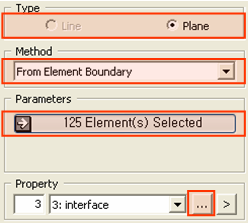 1. Select Type: Plane. 2. Select Method :From Element Boundary. 3. Select 125 Elements to be generated as an Interface element. 4. Click 5. Click [OK].