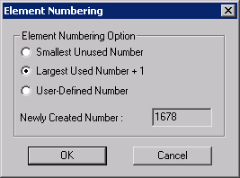 Element Numbering OptionSmallest Unused Number Select the option when the smallest number among the unused element numbers is to be assigned Largest Used Number + 1 Select the option when the largest element number currently in use +1 is to be assigned User-Defined Number Select the option when user-defined number is to be assigned |
