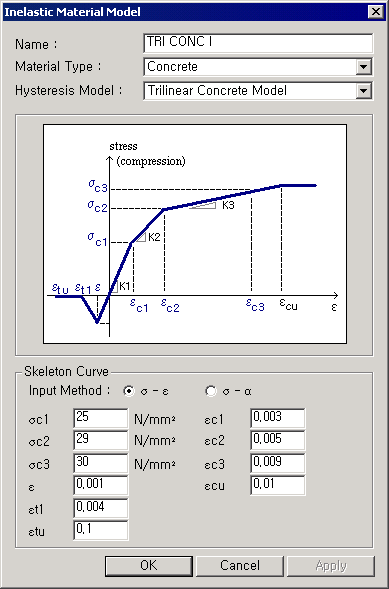 Both tensile and compressive zones can be defined in this model. Trilinear hysteresis exists in the compression zone, which can be defined by the stress-strain relationship and the stress-stiffness reduction ratio relationship.