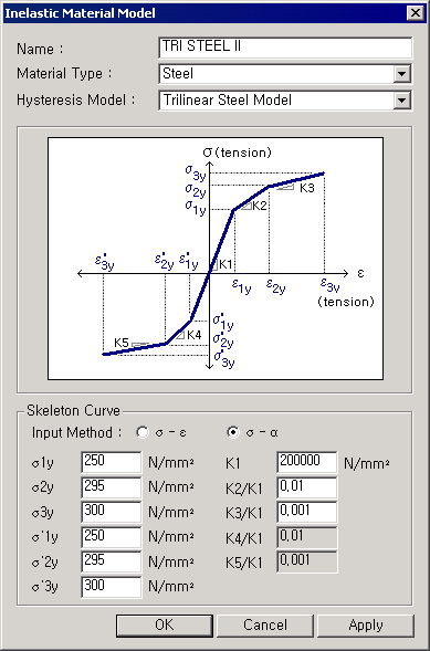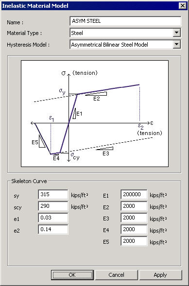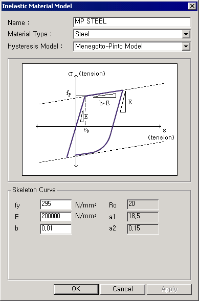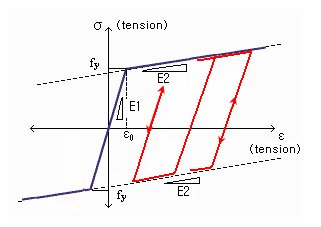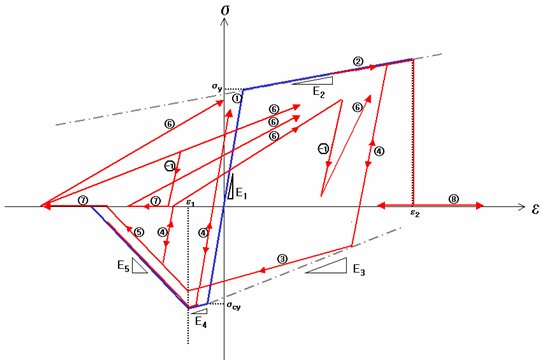 This model has been derived from the general bilinear steel model. Stiffness after compressive and tensile yielding can be freely defined. Buckling and rupturing of reinforcing steel can be considered.