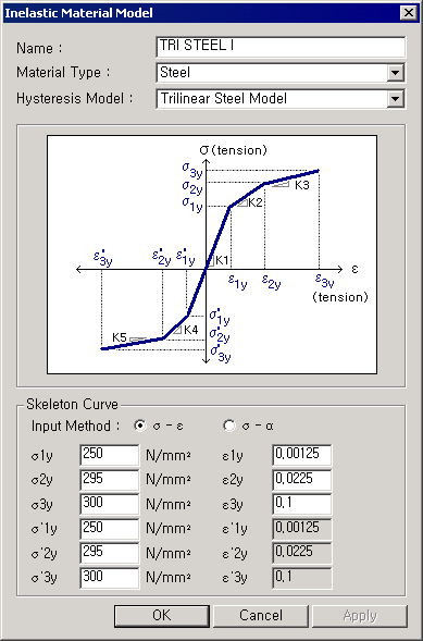 This model represents a Trilinear model of three slopes. The hysteresis can be defined by the stress-strain relationship and the stress-stiffness reduction ratio relationship.