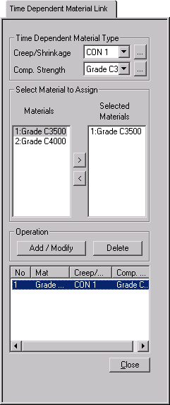 The time dependent material properties defined in "Time Dependent Material (Creep/Shrinkage)" are related to the conventional material data already entered. The properties entered here are applied to Construction Stage analysis and Heat of Hydration analysis but not to other analyses.