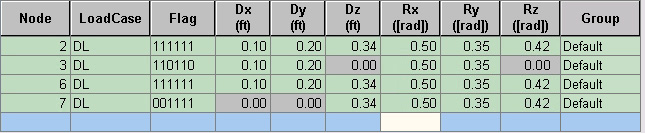 Enter or modify Specified Displacements of Supports at specific nodes, in a spreadsheet format table.