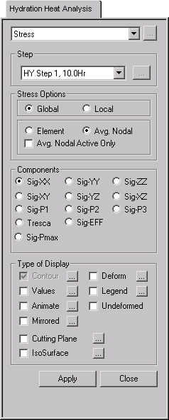 StepSelect a desired heat of hydration analysis step. Stress OptionsDefine options necessary to draw the stresses. Global: Display the stresses with respect to GCS. Local: Display the stresses with respect to the element's local coordinate system.