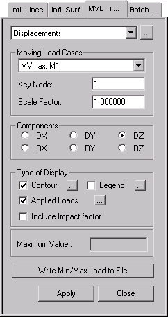 Moving Load CasesSelect a moving load case (vehicle type) that is to be traced and located at a position satisfying the max/min displacement. Key Node: Enter a node number, or click the entry field and the desired node in the working window. Scale Factor: Enter the drawing scale factor for the influence line/surface. This does not affect the influence line/surface values.