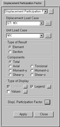 Based on a lateral load case, displacement participation by each element for each force component (Axial, Torsional, Moment-y, Moment-z, Shear-y & Shear-z) can be checked in Contour and Value. In order to check the displacement participation factor, a unit load needs to be input in the direction of the lateral load at the location of the maximum displacement.