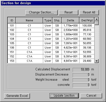 Click the Displ. Participation Factor button to prompt a dialog box, which shows the prediction of lateral displacement and the change of weights based on changing sections.
