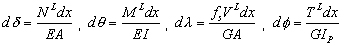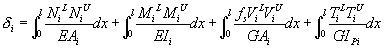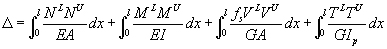 If the above beam behaves linearly, and we define the internal forces caused by the external load L as , the deformation of the beam element becomes