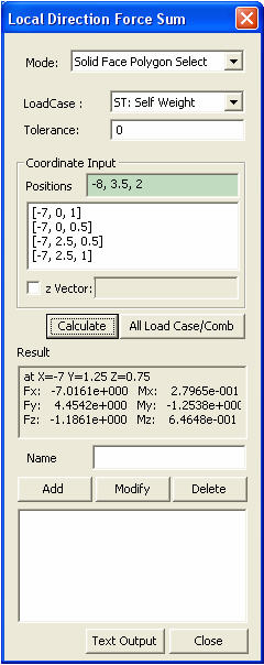 Local Direction Force Sum provides internal forces on a selected plane in plate or solid elements. The resultant forces and the acting point are calculated on the basis of all the nodal forces included in the selected plane. Once a detail analysis is carried out for a specific part of the structure, this function conveniently calculates the member forces for structural design.