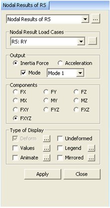 Load Cases/CombinationsSelect a desired RS load case. OutputInertia Force: Inertia force at a node Acceleration: Acceleration at a node Mode: Inertial force and acceleration at a node for the selected Mode Note When this option is checked off, inertia force and acceleration calculated using the selected method from Modal Combination Control of Response Spectrum Load Case is displayed.