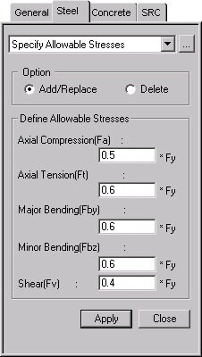 Use this function to enter the allowable stress coefficients. Often, the user may wish to define the allowable stresses rather than using the values calculated according to the applied design code during the strength verification of steel members. The coefficient values entered are ratios to the yield strength (Fy) of the relevant steel material.