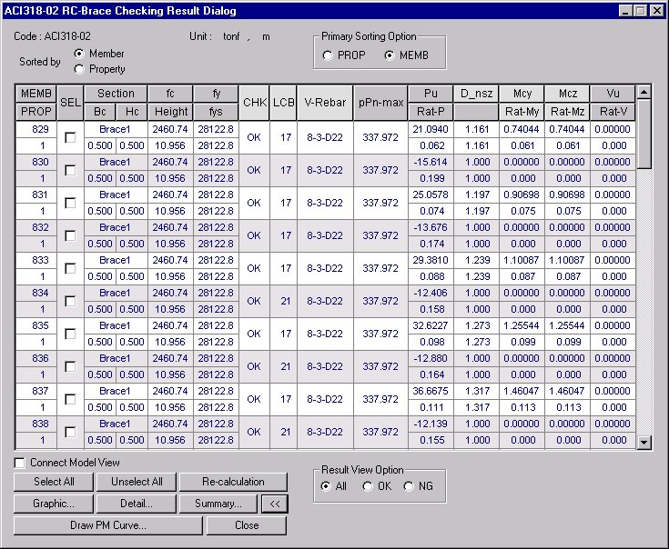 "Sorted by Property" displays the strength verification results of the maximum strength ratios obtained from the P-M interaction diagrams and factored shear forces representing all the elements attributed to the relevant section property. Since the results do not pertain to a single element, ELEM (element number) is "0".
