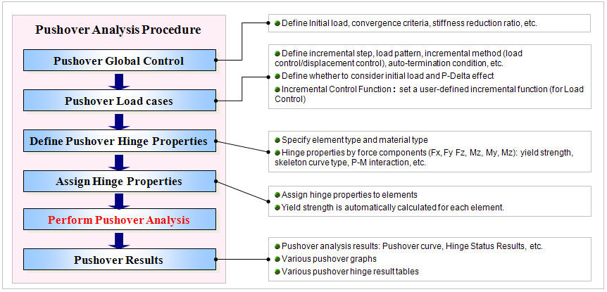 Pushover analysis can be performed in the post-processing mode. The procedure is as follows. In case of concrete member, reinforcement data must be entered before performing pushover analysis in order to obtain reasonable hinge properties.