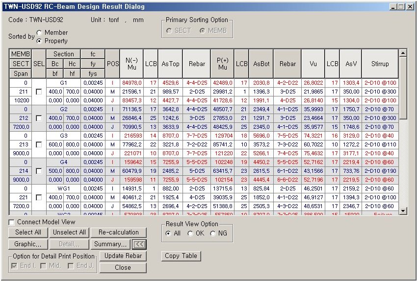 Sorted by Member: Display the design results by individual members. Arrangement order is based on the 'Primary Sorting Option' shown below. Sorted by Property: Display the design results of the maximum factored negative and positive moments and shear forces by sectional locations representing all the members attributed to the relevant section property. Since the results do not pertain to a single member, MEMB (member number is "0". Once Property is selected, SEL controls all the members attributed to the same section properties. |
