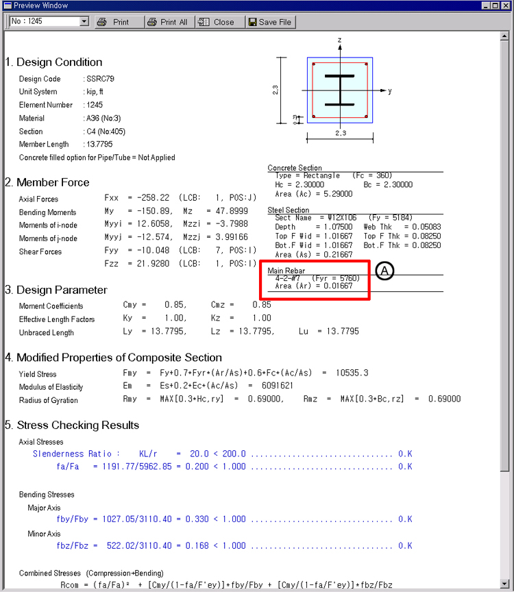 Check the reinforcing information and design results of SRC members by numerical components and contours.