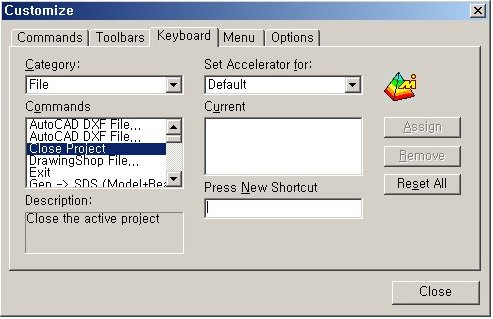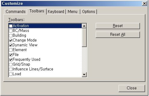 Select options for displaying Tree View, Message Window (Command Line) and Status Bar on the screen, and setup detailed options for Tool Bar. Assign Shortcut Keys to frequently used functions, or modify/delete them.