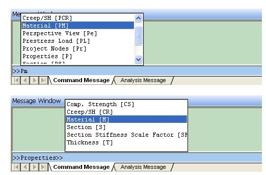 Since, P represents a group key for Properties and M represents a command key for Material, typing PM will invoke the material properties dialog box. Another option is to type the characters separately. If P is typed then the program will invoke the Properties group and a pop-up list will appear showing the commands that can be chosen. If M is typed, then the program will invoke the Material properties dialog box, which is the same as typing PM.