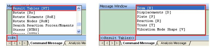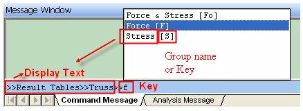 The user selects the Result table by typing RT and the Truss Group by typing T again. Then a pop-up list of Command Keys which is included to the Truss Group will display.