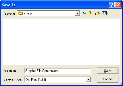 Note File type to save can be selected among *.*(All Files), *.emf (Emf Files), *.bmp (Bmp Files), *.jpg (JPG files), *.dxf (Dxf Files) and *.dwg (Dwg Files). When *.dxf is selected, the program internally generates Meta file (emf) and execute Tools > Convert Meta Files to DXF Files.