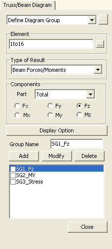 Using the User Defined Diagram, member forces and stresses of the beam elements as well as displacements, truss member forces and stresses, can be drawn in a diagram. In addition, various results by element types (or element groups) can be drawn in the same diagram simultaneously.