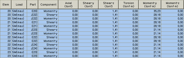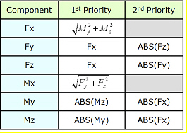 In case Max or Min member forces are the same under 2 or more load cases, the corresponding concurrent forces are tabulated by the priority shown in the table below. For example, when two or more settlement load cases produce a same maximum Fx in an element, the concurrent forces are tabulated for the settlement load case, which produces the largest value of SQRT(My^2+Mz^2).