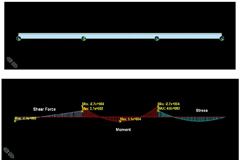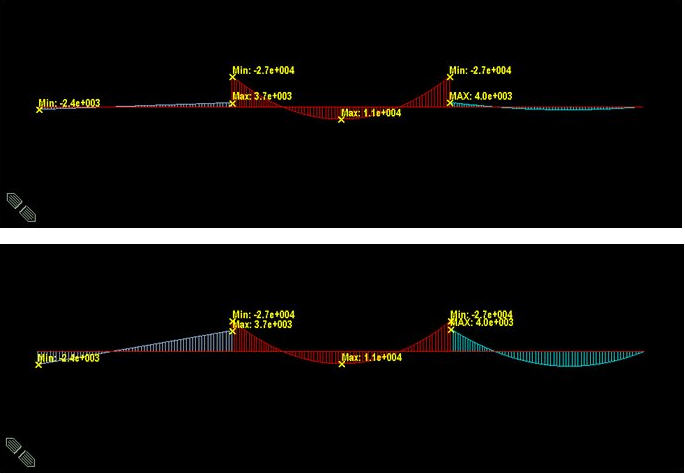 Min/Max: Minimum and maximum bending moments are numerically displayed at the corresponding locations among the 5