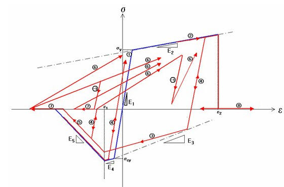 Skeleton Curve: Specify the property values defining the hysteretic behavior of the fiber material following the diagram.