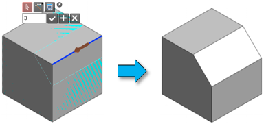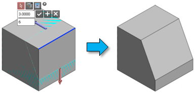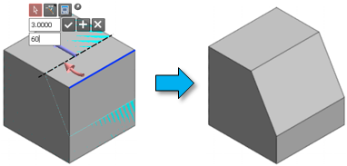 : Distance and Angle : Enter chamfer distance of one edge then define the angle between the chamfered edge to the other edge.