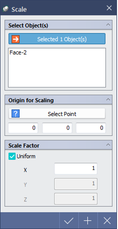 Scale enlarges/reduces selected face body(2D) or solid body(3D) in reference to a point.