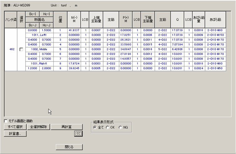 断面選定の結果の表示(ボタンが = "OK" : 設計用正・負曲げモーメント及び設計用せん断力が部材耐力以下に納まっている場合 = "N***" : 設計用負曲げモーメントに対して部材耐力が不足する場合 = "*P**" : 設計用正曲げモーメントに対して、部材耐力が不足する場合 = "**Q*" : 設計用せん断力に対して、部材耐力が不足する場合 = "NP**" : 設計用正・負曲げモーメントに対して、部材耐力が不足する場合 = "*PQ*" : 設計用正曲げモーメント及び設計用せん断力に対して部材耐力が不足する場合 = "N*Q*" : 設計用負曲げモーメント及び設計用せん断力に対して部材耐力が不足する場合 = "NPQ*" : 設計用正・負曲げモーメント及び設計用せん断力に対して部材耐力が不足する場合 = "***A" : 許容付着応力度を満足しなかった場合 位置 : 断面選定の位置 (I,M,J) 選定位置の中で"M"に対する結果は、部材の中央部分(1/4, 1/2, 3/4)の中で最大の正・負曲げモーメント及びせん断力に対する断面選定結果を表示します。 N(-)M, LCB : 梁部材で発生した最大設計用負曲げモーメント、及びその時の荷重組合わせ条件 上端主筋量 :上端筋の必要鉄筋量を表示します。設計規準に定められた最小鉄筋量よりも少ない場合には、最小鉄筋量を表示します。 主筋 : ユーザーが入力した主筋径の中で、上端筋に対して最適の主筋径と本数を表示します。 2段配筋以上になる場合は、2段分までの配筋とし、CHKに"N**"を表示します。 = 1段配筋の場合("xx-Dyy" , "xx-#yy") xxは上端筋の本数、yyは鉄筋の呼び名 = 2 段配筋の場合("xx-yy-Dzz" , "xx-yy-#zz") xxは1段目の本数、yyは2段目の本数、zzは鉄筋の呼び名 P(+)M, LCB : 梁部材で発生した最大設計用正曲げモーメント、及びその時の荷重組合わせ条件 下端主筋量 : 下端筋の必要鉄筋量を表示します。設計規準に定められた最小鉄筋量よりも少ない場合には、最小鉄筋量を表示します。 主筋 : ユーザーが入力した主筋径から、下端筋に対して最適の主筋径と本数を表示します。 2段配筋以上になる場合は、2段分までの配筋とし、CHKに"*P*"を表示します。 = 1段配筋の場合("xx-Dyy" , "xx-#yy") xxは下端筋の本数、yyは鉄筋の呼び名 = 2段配筋の場合("xx-yy-Dzz" , "xx-yy-#zz") xxは1段目の本数、yyは2段目の本数、zzは鉄筋の呼び名 Q, LCB : 梁部材で発生した最大設計用せん断力、及びその時の荷重組合わせ条件 あばら筋量 : せん断補強筋の単位長さあたりの必要鉄筋量を表示します。算定結果が規準の最小鉄筋量より少ない場合は規準の最小鉄筋量が表示されます。 Note せん断筋の必要断面積は単位系によって適用されて、単位系がmm, cm, mの場合は、それぞれmm2/m, cm2/m, m2/mに表示されて、単位系がin, ftの場合は、それぞれin2/ft, ft2/ftに表示されます。