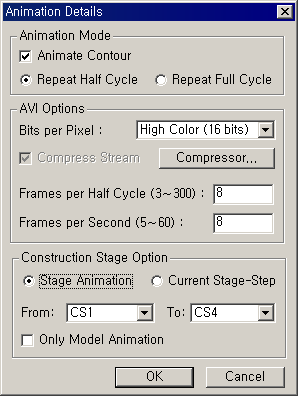 Contour : µ¿Àû¹¦»çÀÇ º¯Çü·®¿¡ µû¶ó º¯ÇüÀ» Ç¥ÇöÇÏ´Â µî°í¼±µµÀÇ »ö»óÀ» º¯È½ÃųÁö ¿©ºÎÁöÁ¤ Note AVI Options : µ¿¿µ»ó ȸéÀÇ Á¦ÀÛ¿¡ ÇÊ¿äÇÑ °¢Á¾ ¼³Á¤»çÇ×À» ÀÔ·ÂÇÕ´Ï´Ù. Bits per Pixel : µ¿ÀûȸéÀÇ ±âÃÊȸéÀ» ¸¸µé ¶§ »ç¿ëµÇ´Â Pixel´ç »ö»ó¼ö Construction Stage Option : ½Ã°ø´Ü°èº° ÇØ¼®À» ¼öÇàÇÑ °æ¿ìÀÇ ¾Ö´Ï¸ÅÀÌ¼Ç ¹æ¹ýÀ» ÁöÁ¤ÇÕ´Ï´Ù. Stage Animation : ½Ã°ø´Ü°èº° ¾Ö´Ï¸ÅÀÌ¼Ç |