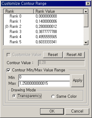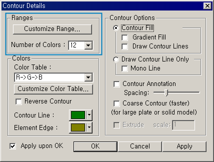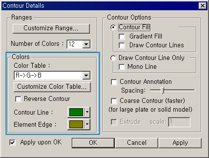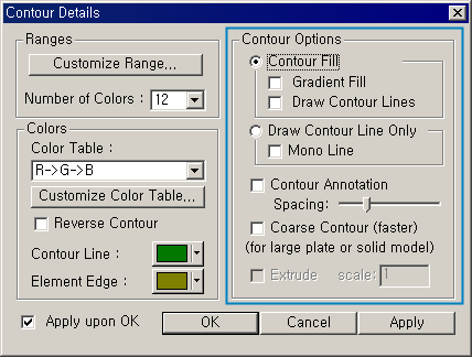 Reverse Contour : Check on ÇÏ¸é µî°í¼±µµÀÇ »ö»óº¯È ¼ø¼¸¦ ¿ªÀ¸·Î º¯°æÇÒ¼ö ÀÖ½À´Ï´Ù. Contour Line : µî°í¼±µµ °æ°è¼±ÀÇ »ö»óÀ» ÁöÁ¤ Element Edge : µî°í¼±µµ¸¦ ³ªÅ¸³¾ ¶§ ¿ä¼Ò ¿Ü°û¼±ÀÇ »ö»óÀ» ÁöÁ¤ |