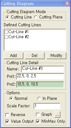 Cutting Line Detail µî·ÏÇÒ Cutting LineÀ» Á¤ÀÇÇÕ´Ï´Ù. Name : µî·ÏÇÒ Cutting LineÀÇ À̸§ Pnt1: Cutting LineÀÇ ½ÃÀÛÁ¡ Pnt2 : Cutting LineÀÇ ³¡Á¡