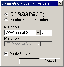 1/2 ¶Ç´Â 1/4 ¸ðµ¨·Î ÇØ¼®ÇÑ °á°ú¸¦ ¸é´ëĪ È®ÀåÇÏ¿© Àüü¸ðµ¨¿¡ ´ëÇÑ ÇØ¼®°á°ú¸¦ Ãâ·ÂÇÕ´Ï´Ù. Half Model Mirroring : 1/2 ¸ðµ¨ÀÎ °æ¿ì ÁöÁ¤ Quarter Model Mirroring : 1/4 ¸ðµ¨ÀÎ °æ¿ì ÁöÁ¤ Mirror by : ¸é´ëĪ È®Àå½Ã ±âÁØÀÌ µÇ´Â ÀüüÁÂÇ¥°èÀÇ Æò¸éÀ» Á¤ÀÇÇϰí, ÇØ´ç Æò¸é¿¡ ¼öÁ÷ÇÑ Ãà¹æÇâÀÇ ÁÂÇ¥°ª ÀÔ·Â |