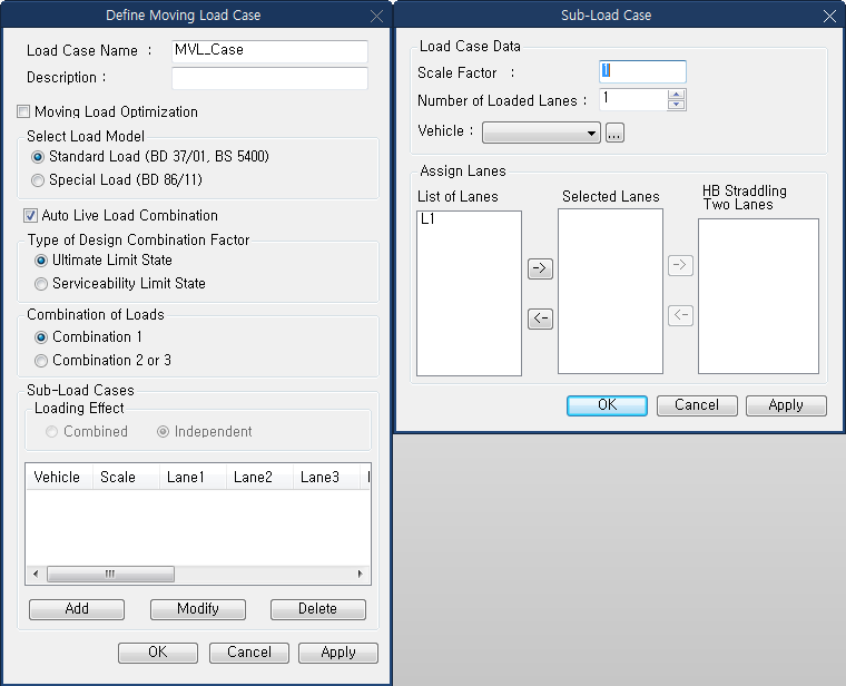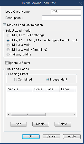 ´ÙÀ½°ú °°Àº 2°³ÀÇ Sub-Load Case¸¦ °®´Â À̵¿ÇÏÁßÁ¶ÇÕÀ» Combined / Independent ¹æ¹ýÀ¸·Î °¢°¢ Á¶ÇÕÇÏ¿´´Ù.